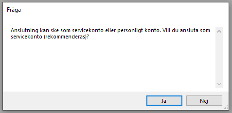 - Anslutning kan ske som servicekonto eller personligt konto - fördelen med servicekonto är att du personligen inte behöver ha de Fortnox-licenser som anslutningen kräver, och det räcker då med att någon har dessa licenser.