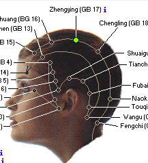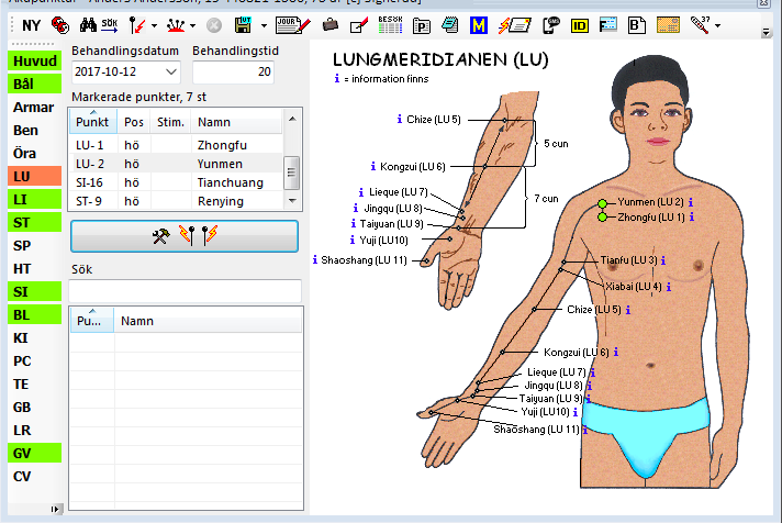 Förutom översiktsbilderna Huvud, Bål, Armar, Ben och Öra finns bilder för varje meridian, ex LUNGMERIDIANEN (LU).