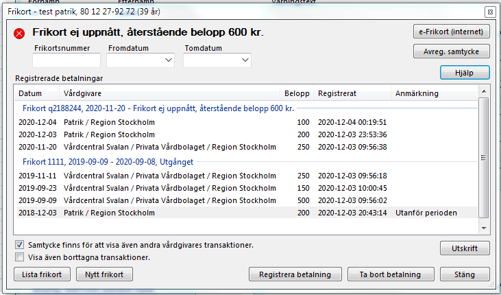 "Registrera betalning" Om du behöver efterregistrera besök eller t.ex. om patienten varit hos annan vårdgivare som ej har e-frikort.