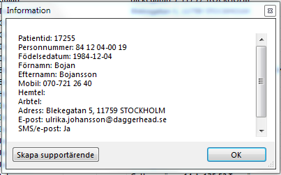 Om en patient är markerad och du trycker (Ctrl + I) så visas en sammanställning av uppgifter om patienten: