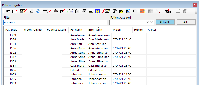 Som standard visas dina aktuella patienter, d.v.s. dina patienter med öppna ärenden, se Patientöversikten. Om patienten inte finns bland aktuella patienter kan du trycka Enter, eller klicka på "Alla" om skrivit söktext i textrutan Filter. Då söker du bland alla patienter som finns i systemet.