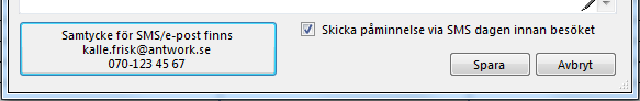 i de flesta fönster kan du skicka SMS till patienten, under förutsättning att du har registrerat patientens mobilnummer och att patienten samtycker till kommunikation via SMS. Mobilnumret och samtycket registreras i