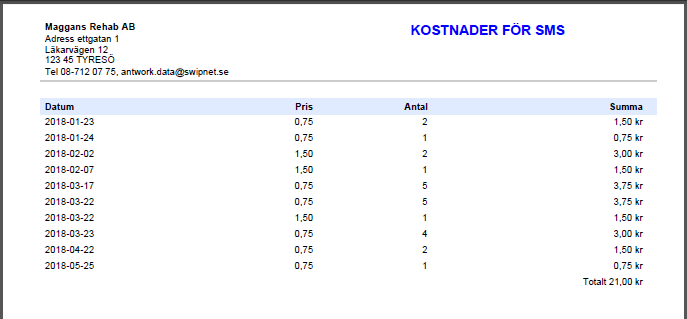 Under Arkiv | SMS-kostnader kan du se hur många SMS du har skickat och hur mycket det har kostat.