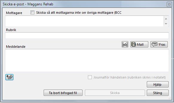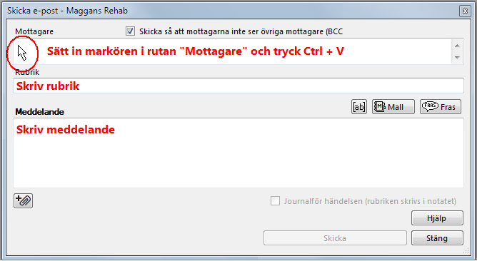 Du kan använda mallar, fraser och "taggar" i mailet och även få det automatiskt journalfört. Vill du skicka e-post till fler mottagare, separera adresserna med kommatecken.