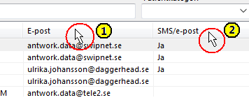 - Sortera på SMS/e-post (att patienten godkänt kommunikation via e-post) genom att klicka på kolumnhuvudet SMS/e-post.