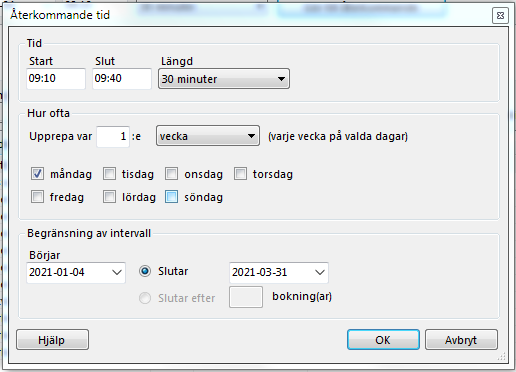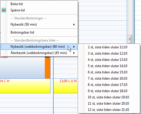 - Högerklicka på tiden i tidboken och välj hur många tider som skall läggas ut.