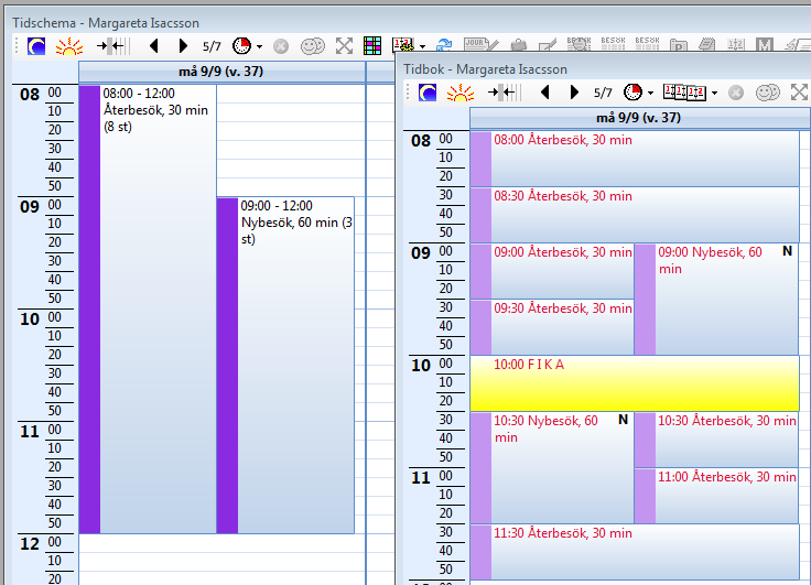 Tidsschemat anpassar sig efter dina tider i tidboken och så här kan det se ut vid t.ex. fikarast och en inbokad patient.