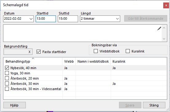 Förutsättningen för att skapa tidsschema är att du lagt upp lämpliga behandlingstyper.