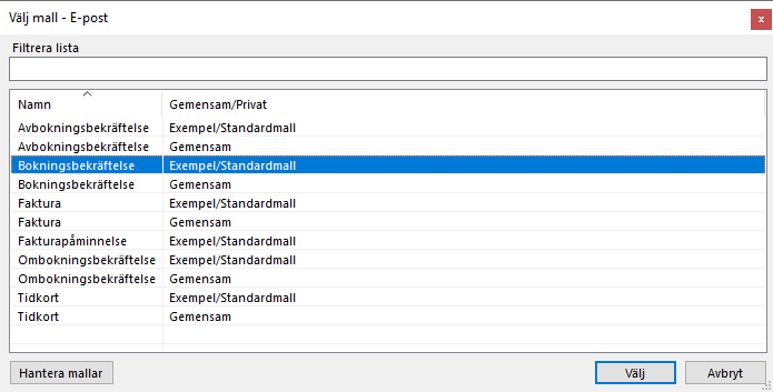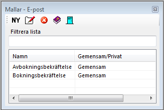 Om du inte har skapat en egen mall som heter "Bokningsbekräftelse" använder SGX en inbyggd mall när en bokningsbekräftelse skickas via e-post. De inbyggda mallarna ligger inte i listan med mallar.