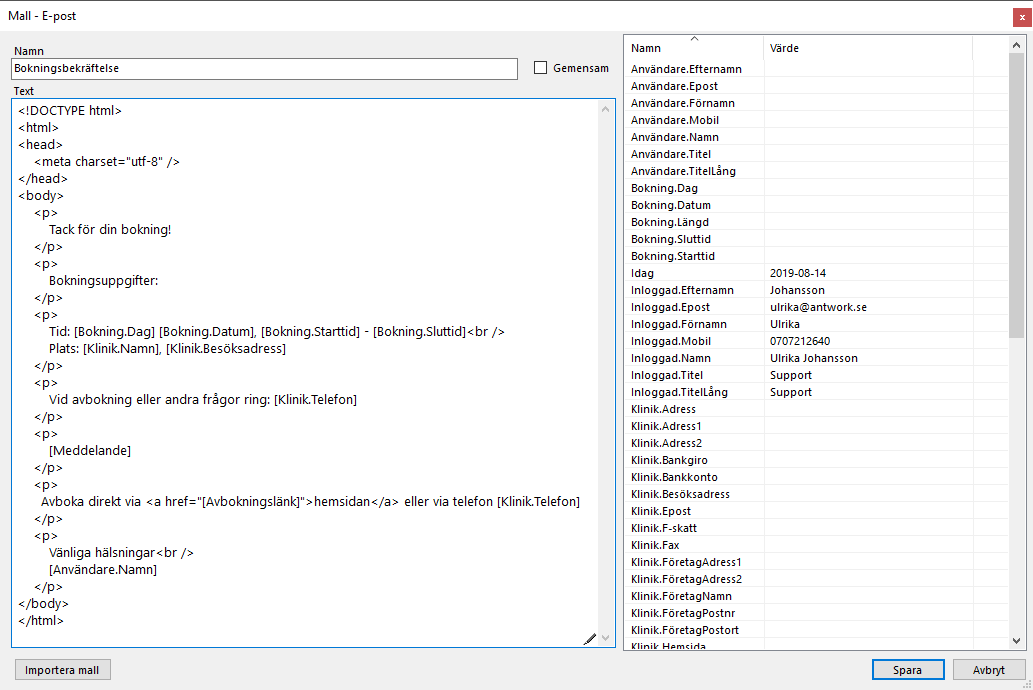 - Om du vill att patienten själv ska kunna avboka sin tid kan du lägga in en avbokningslänk i mallen.
