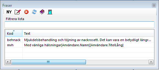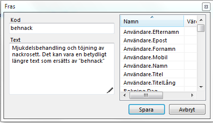 Du kan skapa och editera fraser som automatiskt ersätter den text du skriver. Tex. om Du skriver "behnack" (enligt ovan) och trycker mellanslag så ersätts "behnakc" med "Mjukdelsbehandling och töjning av nackrosett.....".