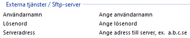 Mata in dina Sftp-uppgifter i Inställningar | Klinikinställningar | Externa tjänster | Sftp-server. Du kan testa om dina uppgifter är korrekt upplagda. Läs hur i artikel Testa anslutning.