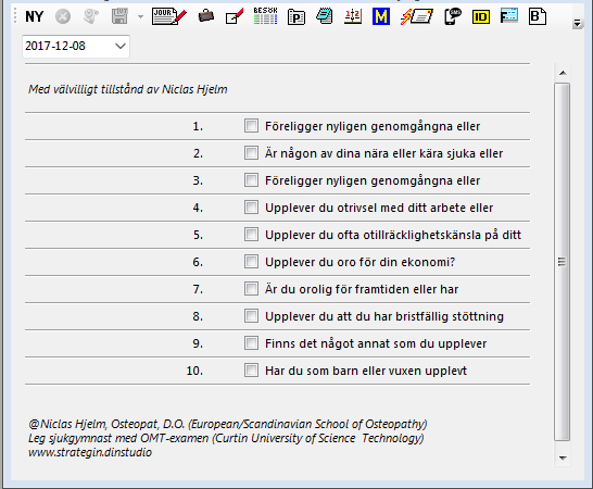 Efter kursen "Strategi för identifiering av patologi" tyckte jag detta var en viktig del i vår dagliga kontakt med patienter och fick också tillstånd av Niclas att använda hans frågeformulär i SG-X. Därmed får Ni alla del av dem.
