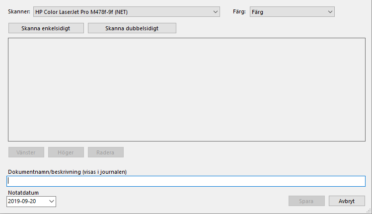 Se till att scannern är inkopplad och igång, klicka på "Skanna". Du kan skanna fler dokument, du kan också ändra ordningen på dokumenten, det kan vara praktiskt om du har en dokumentmatare men inte har dubbelsidig funktion. Då kan du skanna bunten och sedan ändra ordningen som du vill.