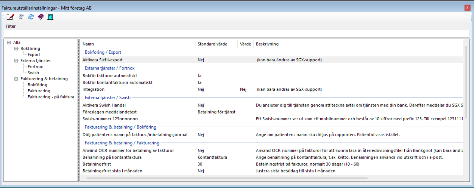 Ange om patientens personnummer skall skrivas på faktura. Inställningen gäller för privatfakturor, för företag gäller inställning på resp. företag.