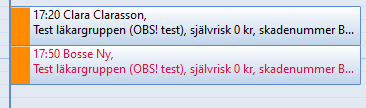 Bokningar med kopplad patient visas med svart text. Exempel Clara Clarasson.