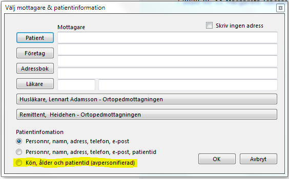 Det viktiga här är patientinformationen. Välj det nedre alternativet med Kön, ålder och patientid.