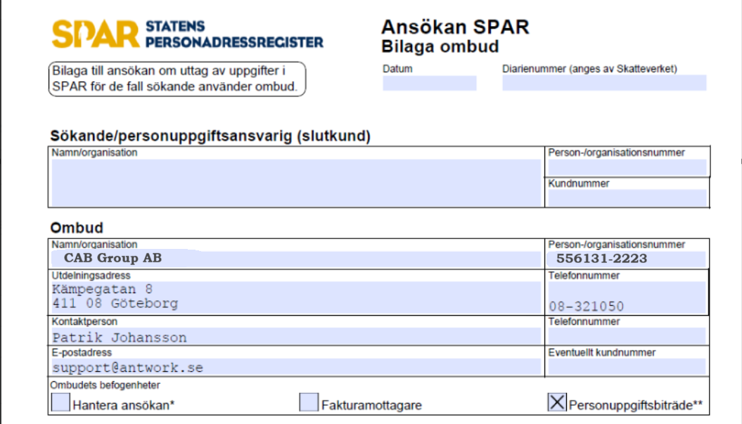 - SKV 1546 Bilaga för att ange att CAB Healthcare & Antwork är dina ombud