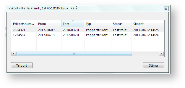 Det går även att visa historik på nuvarande och tidigare frikort: