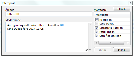 Som i din vanliga mail, skriv Ärende, Meddelande och klicka i mottagare och "Skicka".