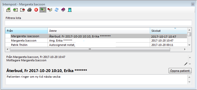 Är lite speciell. Det är receptionspost. Den kan alla receptionister öppna (om det finns fler). Om en behandlare ska skicka ett meddelande till receptionen behöver hen inte veta vem som är i tjänst just då utan skickar till "Receptionens" brevlåda och då kan alla receptionister läsa den. Receptionisten har även en "privat" brevlåda under