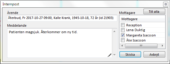 Du kan skriva ett meddelande från dig/patienten och kolla att mottagaren är rätt (eg. förvald). Klicka på "Skicka".