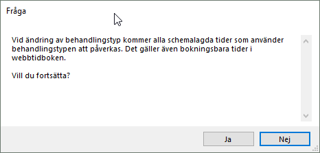Ändringar av behandlingstyper påverkar alla redan schemalagda bokningsbara tider som använder behandlingstypen så var noga när du ändrar så att du inte påverkar dina eller andras tidsschema. Vid ändring av en behandlingstyp får du en varning om detta: