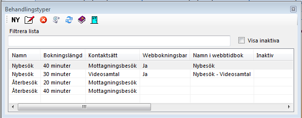 Du lägger upp de behandlingstyper som du vill använda vid schemaläggning av bokningsbara tider.