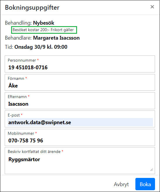 När patienten klickar på bokningen visas ett bokningsformulär: