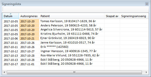 För att signera direkt från listan, markera raden och klicka på ![]()