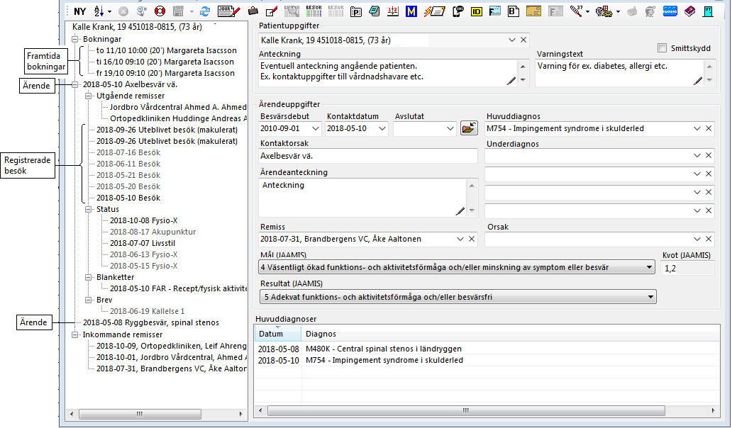 I Patientöversikten visas patientens alla ärenden och information kopplad till patientens behandlingsomgång som t.ex. besök, statusar, remisser och framtida bokningar. Detta för att få en sammanhållen struktur av uppgifter som kan ligga till grund för statistik och kvalitetsuppföljning.