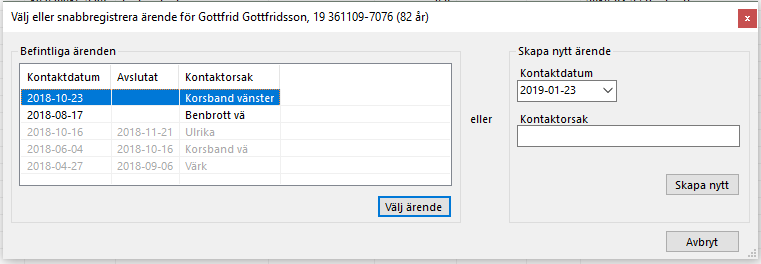 - Vid snabbregistrera eller skapa nytt ärende hämtas kontaktorsak från patientens senaste stängda ärende. Du ändrar eller behåller det.