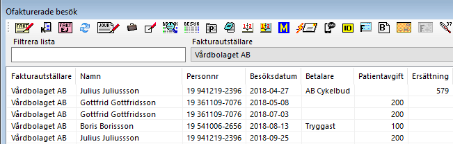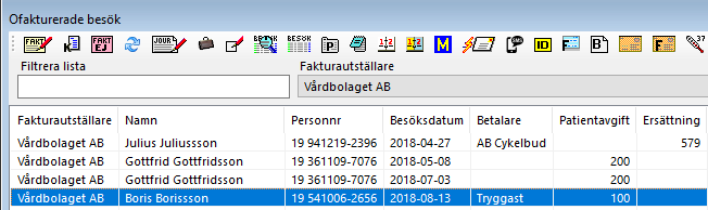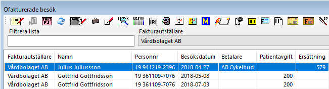 Markera en eller flera rader i listan med ersättning. Ersättning betalas av ett företag eller försäkringsbolag. Om besöket är ett regionsbesök faktureras ersättningen på fil till regionen.