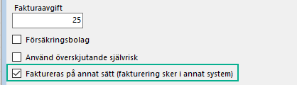 Om du har företag eller försäkringsbolag som du alltid fakturerar på annat sätt kan du markera "Faktureras på annat sätt (fakturering sker i annat system)" under bolagsinställningarna. Då sätts ersättningen automatiskt som betald i SGX och besöket kommer inte upp i listan Ofakturerade besök.