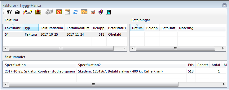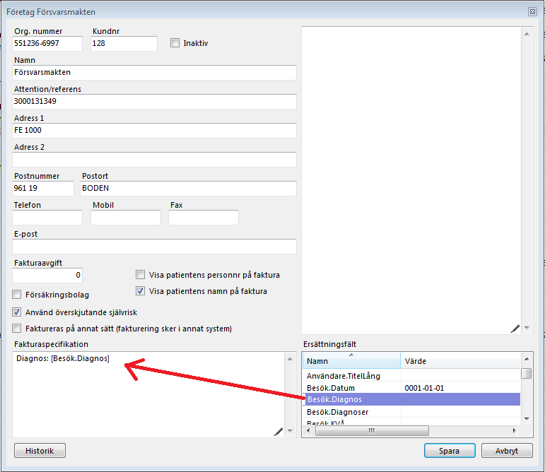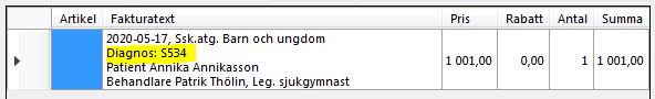 Du kan i viss mån anpassa fakturautskriften för varje företag. Se ovan där man valt att skriva ut besökets diagnos på fakturan. Det kommer att se ut som nedan på fakturan: