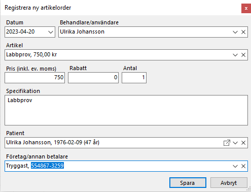 Du kan fritt lägga till artiklar och skapa ett ofakturerat underlag med artikelordrar för en patient eller ett företag som sedan kan ingå i samlingsfaktura till vald betalare.