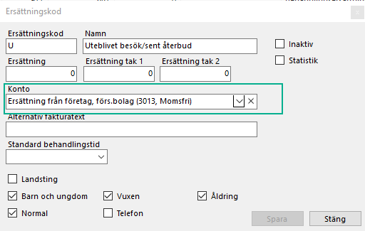 Vid fakturering av ersättning till företag eller försäkringsbolag så lägger du till bokföringskonto på den ersättningskoden som du har använt. Inställningar | Ersättningskoder och redigera den ersättningskod som du har valt på besöket.