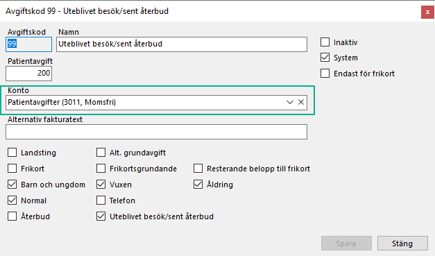 Vid fakturering av patientavgift så lägger du till bokföringskonto på den avgiftskoden som du har använt. Gå in under Inställningar | Avgiftskoder och redigera den avgiftskod som du har valt på besöket.