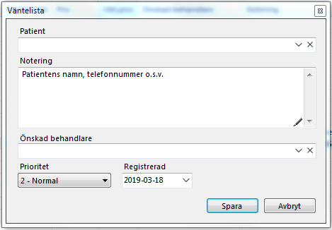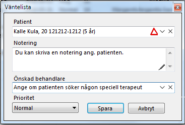 När Du lägger till en patient på väntelistan kan Du skriva en notering och ange om patienten söker någon speciell terapeut.