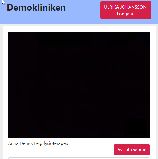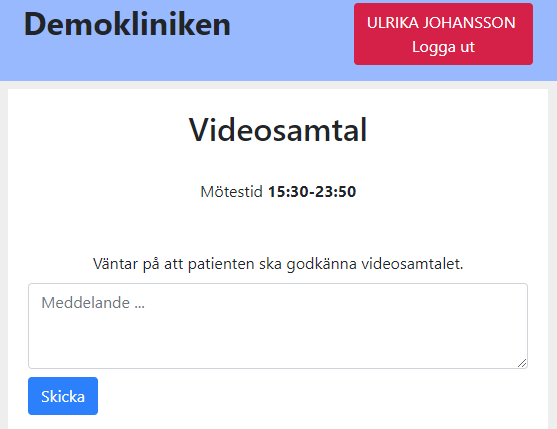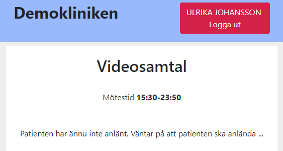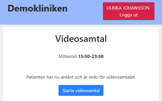 - Information om att patienten har anlänt visas och knapp för att starta videosamtal blir tillgänglig.